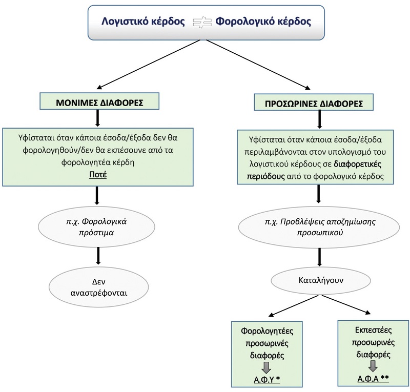 Στο παρακάτω σχήμα απεικονίζονται οι περιπτώσεις των διαφορών που δημιουργούνται μεταξύ λογιστικού και φορολογητέου κέρδους: