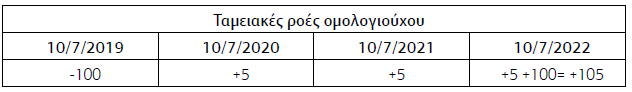 Ας πάρουμε την περίπτωση ενός ομολόγου, ονομαστικής αξίας 100 ευρώ, τριετούς διάρκειας και σταθερού επιτοκίου 5%, το οποίο εκδίδεται στις 10/7/2019. Τότε, οι χρηματικές ροές του επενδυτή-ομολογιούχου είναι οι παρακάτω:
