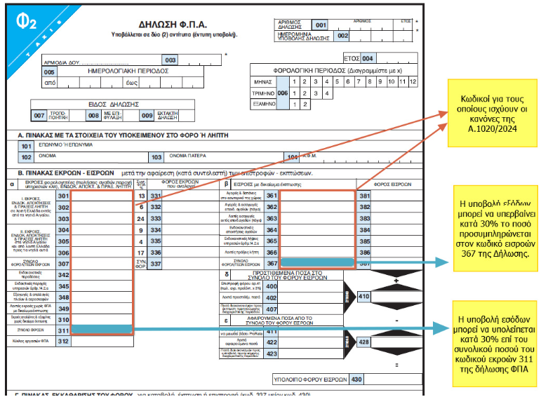 γ) Η υποβολή εξόδων, που υπερβαίνουν αυτών που έχουν διαβιβαστεί στην ψηφιακή πλατφόρμα myDATA, ανά φορολογική περίοδο ΦΠΑ στους σχετικούς κωδικούς του πίνακα εισροών με τους αντίστοιχους φόρους, επιτρέπεται έως του ποσοστού ανεκτού ορίου απόκλισης, τριάντα τοις εκατό (30%) επί του συνολικού ποσού που προ-συμπληρώνεται στον κωδικό εισροών 367 της Δήλωσης ΦΠΑ.