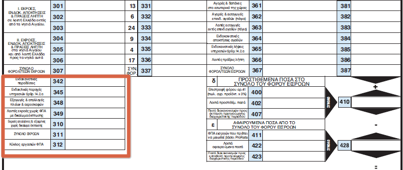 Τα έξοδα της περίπτωσης αυτής που υπολείπονται των εξόδων προ-συμπλήρωσης δύναται να περιλαμβάνουν όσα χαρακτηρίζονται με 2.5-Γενικά έξοδα χωρίς δικαίωμα έκπτωσης, όσα απορρίπτονται από τον Λήπτη τους, καθώς και κάθε άλλη περίπτωση εξόδων κατά την οποία ο Λήπτης επιλέγει να μην τα εκπέσει από τη Δήλωση ΦΠΑ.