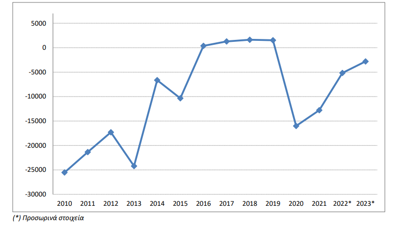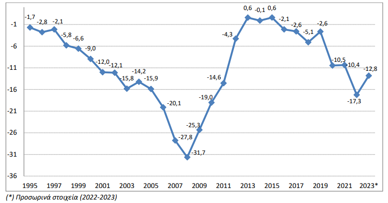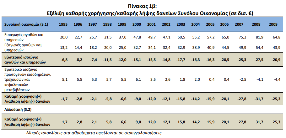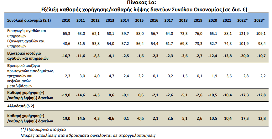 Ειδικότερα, στο έτος 2023 καταγράφηκε έλλειμμα στο εξωτερικό ισοζύγιο αγαθών και υπηρεσιών 10,7 δισ. ευρώ έναντι ελλείμματος 20,0 δισ. ευρώ που είχε καταγραφεί το 2022 (Πίνακας 1α). Η συνολική οικονομία (S.1) παρουσίασε το 2023 καθαρή λήψη δανείων 12,8 δισ. ευρώ σε σχέση με την αλλοδαπή (S.2) σε σύγκριση με το 2022 που η καθαρή λήψη δανείων ανερχόταν σε 17,3 δισ. ευρώ (Πίνακας 1α).