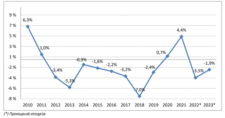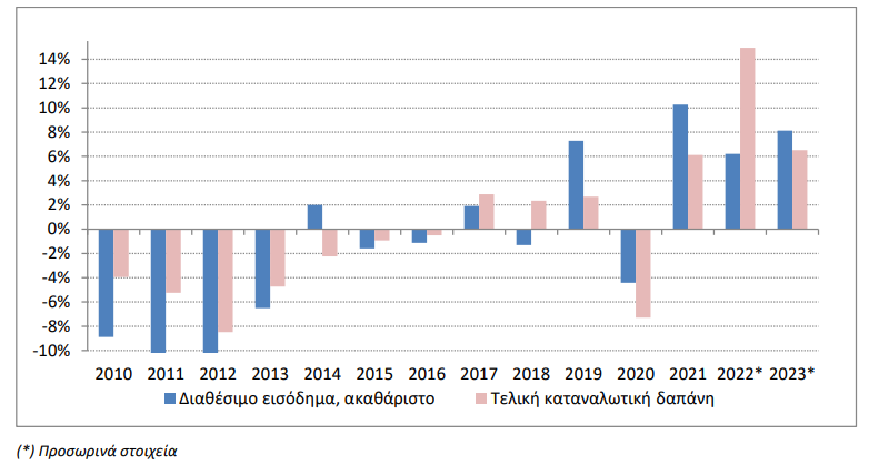Διάγραμμα 2: Εξέλιξη του ακαθάριστου διαθέσιμου εισοδήματος και της καταναλωτικής δαπάνης των Νοικοκυριών και ΜΚΙΕΝ (μεταβολή σε σχέση με το προηγούμενο έτος)