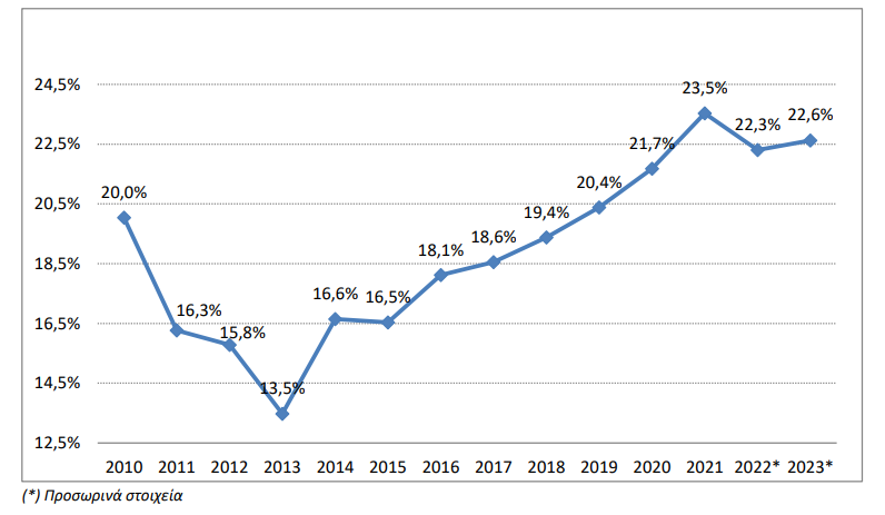 Στο Διάγραμμα 4 παρουσιάζεται η εξέλιξη του ποσοστού των επενδύσεων του τομέα των μηχρηματοοικονομικών εταιρειών, που ορίζεται ως ο ακαθάριστος σχηματισμός παγίου κεφαλαίου προς την ακαθάριστη προστιθέμενη αξία. Ειδικότερα το ποσοστό των επενδύσεων ήταν 22,6% το 2023 σε σύγκριση με 22,3% το 2022.