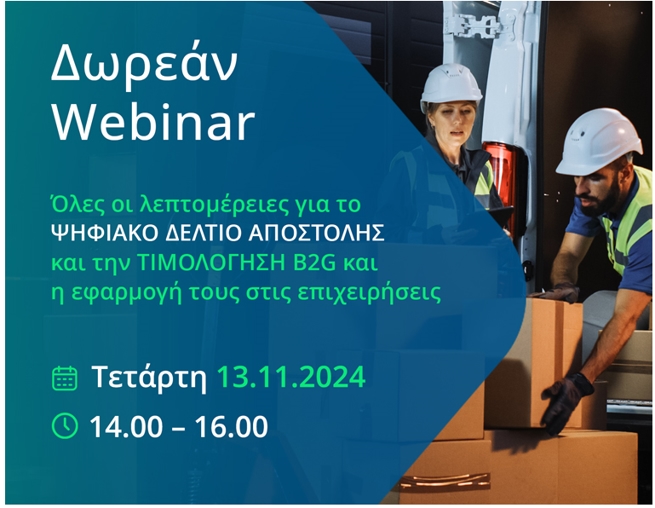 Παρακολουθήστε το δωρεάν webinar που διοργάνωσαν το e-forologia και το Tax Heaven, με τίτλο: «Όλες οι λεπτομέρειες για το ΨΗΦΙΑΚΟ ΔΕΛΤΙΟ ΑΠΟΣΤΟΛΗΣ και την ΤΙΜΟΛΟΓΗΣΗ B2G και η εφαρμογή τους στις επιχειρήσεις».