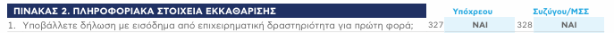 | Πίνακας 2 | 327–328 | Κωδικοί προσαρμογής προκαταβολής για πρώην νέους επιτηδευματίες (μείωση 50%) — επαναβεβαίωση και στην Α.1062 με την ίδια λειτουργία. | |