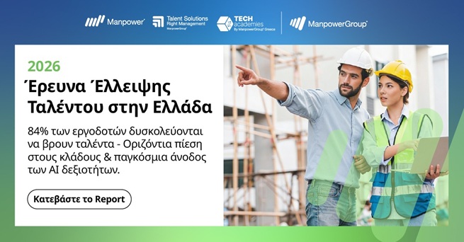 Η Έρευνα Έλλειψης Ταλέντου 2026 της ManpowerGroup αναδεικνύει τη διαρθρωτική πρόκληση για την ελληνική αγορά εργασίας, καθώς το 84% από τους 520 εργοδότες δηλώνει δυσκολία εύρεσης ανθρώπων με εξειδικευμένες δεξιότητες - αυξημένο κατά 2% σε σχέση με το 2025- επιβεβαιώνοντας ότι το έλλειμμα δεξιοτήτων παραμένει σε ανοδική τροχιά. Η περαιτέρω αύξηση της έλλειψης ταλέντου στην Ελλάδα συνδέεται με την ταυτόχρονη ενίσχυση της ζήτησης για τεχνικές και ψηφιακές δεξιότητες, την επιτάχυνση επενδύσεων σε βασικούς κλάδους όπως οι κατασκευές και η βιομηχανία, αλλά και τη συνεχιζόμενη απόκλιση ανάμεσα στις ανάγκες της αγοράς και τις διαθέσιμες, εφαρμοσμένες δεξιότητες του ανθρώπινου δυναμικού.