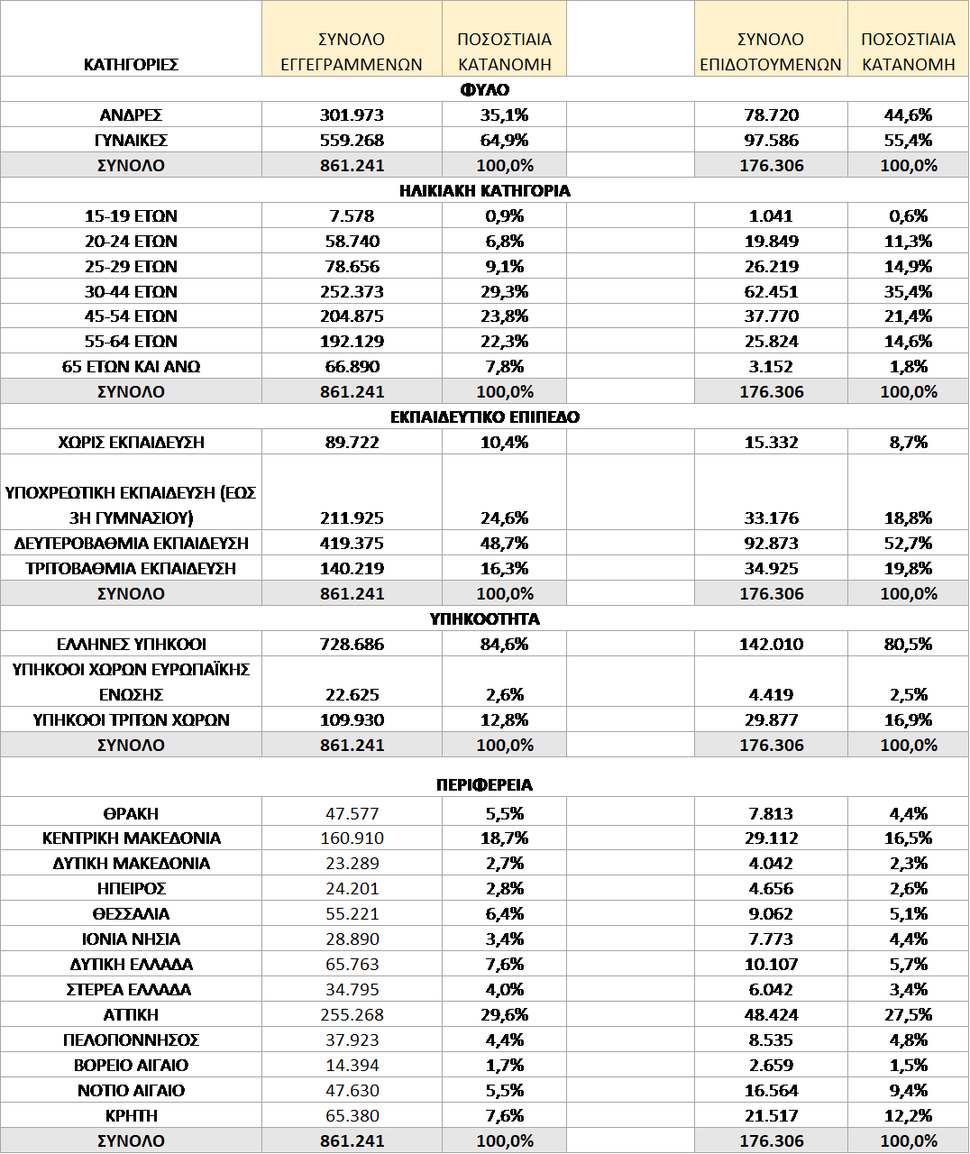 ΠΙΝΑΚΑΣ 1: ΣΥΝΟΛΟ ΕΓΓΕΓΡΑΜΜΕΝΩΝ ΚΑΙ ΕΠΙΔΟΤΟΥΜΕΝΩΝ ΚΑΤΑ ΦΥΛΟ, ΗΛΙΚΙΑΚΗ ΚΑΤΗΓΟΡΙΑ, ΕΚΠΑΙΔΕΥΤΙΚΟ ΕΠΙΠΕΔΟ, ΥΠΗΚΟΟΤΗΤΑ ΚΑΙ ΠΕΡΙΦΕΡΕΙΑ