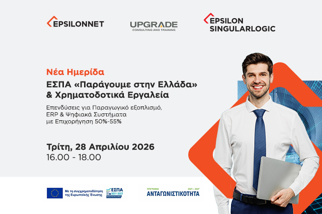 Στο πλαίσιο της συνεχόμενης στήριξης των επιχειρήσεων για την ψηφιακή τους αναβάθμιση, ο Όμιλος EPSILONNET, σε συνεργασία με την εταιρία EPSILON SingularLogic και την εταιρία συμβούλων UPGRADE Consulting and Training, διοργανώνει ενημερωτική ημερίδα με στόχο την παρουσίαση σύγχρονων επενδυτικών προγραμμάτων και χρηματοδοτικών εργαλείων για την ενίσχυση της επιχειρηματικής ανάπτυξης.