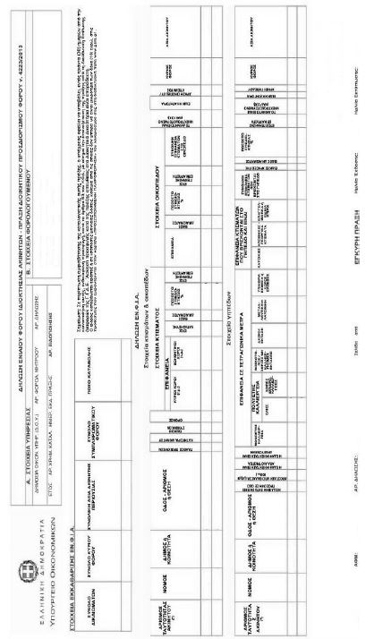 | ΕΦΗΜΕΡΙΣ ΤΗΣ ΚΥΒΕΡΝΗΣΕΩΣ ΤΗΣ ΕΛΛΗΝΙΚΗΣ ΔΗΜΟΚΡΑΤΙΑΣ ΤΕΥΧΟΣ ΔΕΥΤΕΡΟ Αρ. Φύλλου 2143 6 Οκτωβρίου 2015 ΑΠΟΦΑΣΕΙΣ Αριθμ. ΠΟΛ. 1216 Τύπος και περιεχόμενο της δήλωσης - πράξης διοικητικού προσδιορισμού Ενιαίου Φόρου Ιδιοκτησίας Ακινήτων (ΕΝ.Φ.Ι.Α.) έτους 2015 και επομένων. Η ΓΕΝΙΚΗ ΓΡΑΜΜΑΤΕΑΣ ΔΗΜΟΣΙΩΝ ΕΣΟΔΩΝ ΤΟΥ ΥΠΟΥΡΓΕΙΟΥ ΟΙΚΟΝΟΜΙΚΩΝ Έχοντας υπόψη: 1. Τις διατάξεις των άρθρων 1 , 2 , 3 , 4 , 5 , 6 , 7 , 8 , 9 και 10 και 13 του N. 4223/2013 (ΦΕΚ 287 Α΄), περί Ενιαίου Φόρου Ιδιοκτησίας Ακινήτων (ΕΝ.Φ.Ι.Α.). 2. Τις διατάξεις της περίπτωσης ε΄ της παραγράφου 2 του άρθρου 18 του N. 4174/2013 (ΦΕΚ 170 Α΄). 3. Τις διατάξεις της υποπαραγράφου Ε2 της παραγράφου Ε του πρώτου άρθρου του N. 4093/2012 (ΦΕΚ 222 Α΄), όπως ισχύει, περί σύστασης θέσης Γενικού Γραμματέα Δημοσίων Εσόδων. 4. Την πράξη 20/25-6-2014 του Υπουργικού Συμβουλίου (ΦΕΚ 360 ΥΟΔΔ), περί επιλογής και διορισμού Γενικού Γραμματέα της Γενικής Γραμματείας Δημοσίων Εσόδων του Υπουργείου Οικονομικών. 5. Το γεγονός ότι με την παρούσα απόφαση δεν προκαλείται δαπάνη στον Κρατικό Προϋπολογισμό, αποφασίζουμε: 1. Ο τύπος και το περιεχόμενο της δήλωσης ΕΝ.Φ.Ι.Α. - πράξης διοικητικού προσδιορισμού φόρου έτους 2015 και επομένων έχει ως το συνημμένο υπόδειγμα, το οποίο αποτελεί αναπόσπαστο μέρος της παρούσας. 2. Στις περιπτώσεις, στις οποίες κατά τη μηχανογραφική εκκαθάριση εφαρμόζονται τα οριζόμενα στην ΠΟΛ. 1184/2014 απόφαση της Γενικής Γραμματέως Δημοσίων Εσόδων, επί της δήλωσης ΕΝ.Φ.Ι.Α. - πράξης διοικητικού προσδιορισμού φόρου αναγράφεται ότι ο τρόπος υπολογισμού του φόρου έχει πραγματοποιηθεί σύμφωνα τις διατάξεις της ανωτέρω απόφασης. 3. Στις περιπτώσεις, στις οποίες υπάρχουν ουσιώδεις ελλείψεις στα περιγραφικά στοιχεία ακινήτων, με αποτέλεσμα να μην είναι δυνατός ο υπολογισμός του ΕΝ.Φ.Ι.Α. και να θεωρούνται μη δηλωθέντα, επί της δήλωσης ΕΝ.Φ.Ι.Α. - πράξης διοικητικού προσδιορισμού φόρου υπάρχει ειδική επισήμανση.  Η απόφαση αυτή να δημοσιευθεί στην Εφημερίδα της Κυβερνήσεως. Αθήνα, 1 Οκτωβρίου 2015 Η Γενική Γραμματέας Δημοσίων Εσόδων ΑΙΚΑΤΕΡΙΝΗ ΣΑΒΒΑΪΔΟΥ |