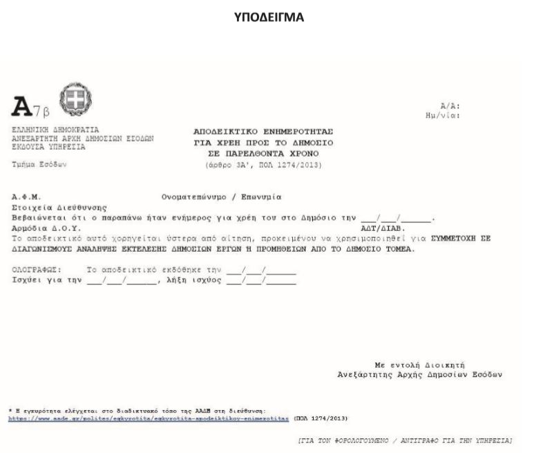 | ΕΦΗΜΕΡΙΔΑ ΤΗΣ ΚΥΒΕΡΝΗΣΕΩΣ ΤΗΣ ΕΛΛΗΝΙΚΗΣ ΔΗΜΟΚΡΑΤΙΑΣ 4 Δεκεμβρίου 2020 ΤΕΥΧΟΣ ΔΕΥΤΕΡΟ Αρ. Φύλλου 5346 ΑΠΟΦΑΣΕΙΣ Αριθμ. Α.1265 Τροποποίηση-Συμπλήρωση των υπό στοιχεία ΠΟΛ. 1274 και ΠΟΛ. 1275/27.12.2013 (Β΄ 3398) αποφάσεων του Γενικού Γραμματέα Δημοσίων Εσόδων περί Αποδεικτικού Ενημερότητας και Βεβαίωσης οφειλής του άρθρου 12 του Ν. 4174/2013 (Α΄ 170), όπως ισχύουν. Ο ΔΙΟΙΚΗΤΗΣ ΤΗΣ ΑΝΕΞΑΡΤΗΤΗΣ ΑΡΧΗΣ ΔΗΜΟΣΙΩΝ ΕΣΟΔΩΝ Έχοντας υπόψη: 1. Τις διατάξεις του άρθρου 12 του Ν. 4174/2013 «Φορολογικές διαδικασίες και άλλες διατάξεις» (Α΄ 170), όπως ισχύουν. 2. Τις αποφάσεις Γενικού Γραμματέα Δημοσίων Εσόδων υπό στοιχεία ΠΟΛ 1274/27.12.2013 , περί αποδεικτικού ενημερότητας και ΠΟΛ 1275/27.12.2013 , περί βεβαίωσης οφειλής (Β΄ 3398), όπως ισχύουν. 3. Την υπό στοιχεία Α. 1173/21.07.2020 απόφαση του Υφυπουργού Οικονομικών «Τροποποίηση και συμπλήρωση της αριθ. 1027320/678/0006Β/24-2-1998 (Β΄ 196) απόφασης του Υπουργού Οικονομικών "Τύπος και περιεχόμενο των χρησιμοποιουμένων από τη Δ.Ο.Υ. Μοσχάτου εντύπων στα υποσυστήματα "Έσοδα - Έξοδα" και "Δικαστικών Ενεργειών" του ολοκληρωμένου Πληροφορικού Συστήματος Φορολογίας (Ο.Π.Σ.Φ. ή TAXIS), όπως τροποποιήθηκε και ισχύει"» (Β΄ 3207). 4. Τις διατάξεις του Κεφαλαίου Α΄ «Σύσταση Ανεξάρτητης Αρχής Δημοσίων Εσόδων» του Μέρους Πρώτου του ν. 4389/2016 «Επείγουσες διατάξεις για την εφαρμογή της συμφωνίας δημοσιονομικών στόχων και διαρθρωτικών μεταρρυθμίσεων και άλλες διατάξεις» (Α΄ 94). 5. Τις διατάξεις της υποπαρ. Ε2 της παρ. Ε του πρώτου άρθρου του ν. 4093/2012 (Α΄ 222), όπως ισχύει, περί σύστασης θέσης Γενικού Γραμματέα Δημοσίων Εσόδων, σε συνδυασμό με τις διατάξεις της παρ. 1 του άρθρου 13 και της παρ. 10 του άρθρου 41 του ν. 4389/2016 , όπως ισχύουν. 6. Την υπό στοιχεία Δ6Α 1015213 ΕΞ 2013/28.01.2013 απόφαση του Υπουργού Οικονομικών και του Υφυπουργού Οικονομικών «Μεταβίβαση αρμοδιοτήτων στο Γενικό Γραμματέα της Γενικής Γραμματείας Δημοσίων Εσόδων του Υπουργείου Οικονομικών» (Β΄ 130 και Β΄372), σε συνδυασμό με τις διατάξεις της παραγράφου 10 του άρθρου 41 του ν. 4389/2016, όπως ισχύουν. 7. Την υπ΄ αρ. 1/20.01.2016 πράξη του Υπουργικού Συμβουλίου «Επιλογή και διορισμός Γενικού Γραμματέα της Γενικής Γραμματείας Δημοσίων Εσόδων του Υπουργείου Οικονομικών» (Υ.Ο.Δ.Δ. 18), σε συνδυασμό με τις διατάξεις της παρ. 10 του άρθρου 41 του ν. 4389/2016, όπως ισχύουν, την υπ΄ αρ. 39/3/30.11.2017 απόφαση του Συμβουλίου Διοίκησης της Α.Α.Δ.Ε. «Ανανέωση της θητείας του Διοικητή της Ανεξάρτητης Αρχής Δημοσίων Εσόδων» (Υ.Ο.Δ.Δ. 689), καθώς και την υπ΄ αρ. 5294/2020 απόφαση Υπουργού Οικονομικών «Ανανέωση της θητείας του Διοικητή της Ανεξάρτητης Αρχής Δημοσίων Εσόδων» (Υ.Ο.Δ.Δ. 27). 8. Την υπό στοιχεία Δ. ΟΡΓ. Α 1125859ΕΞ 2020 απόφαση του Διοικητή της ΑΑΔΕ «Οργανισμός της Ανεξάρτητης Αρχής Δημοσίων Εσόδων (Α.Α.Δ.Ε.)» (Β΄4738), όπως ισχύει. 9. Την ανάγκη τροποποίησης των αποφάσεων περί αποδεικτικού ενημερότητας και βεβαίωσης οφειλής, ώστε οι φορείς στους οποίους προσκομίζεται το αποδεικτικό ενημερότητας/βεβαίωση οφειλής, να ελέγχουν την εγκυρότητα των εντύπων, στα πλαίσια διασφάλισης των συμφερόντων του Δημοσίου και αποφυγής του κινδύνου παραποίησης αυτών. 10. Το γεγονός ότι από τις διατάξεις της παρούσας απόφασης δεν προκαλείται δαπάνη σε βάρος του προϋπολογισμού της ΑΑΔΕ, αποφασίζουμε: 1. Στο άρθρο 2 της υπό στοιχεία ΠΟΛ. 1274/2013 απόφασης προστίθεται παράγραφος η΄ ως εξής: η) «Δεν απαιτείται προσκόμιση αποδεικτικού ενημερότητας εάν πρόκειται για διανομή ή ανταλλαγή κοινών ακινήτων, σύσταση οριζόντιας ή κάθετης ι