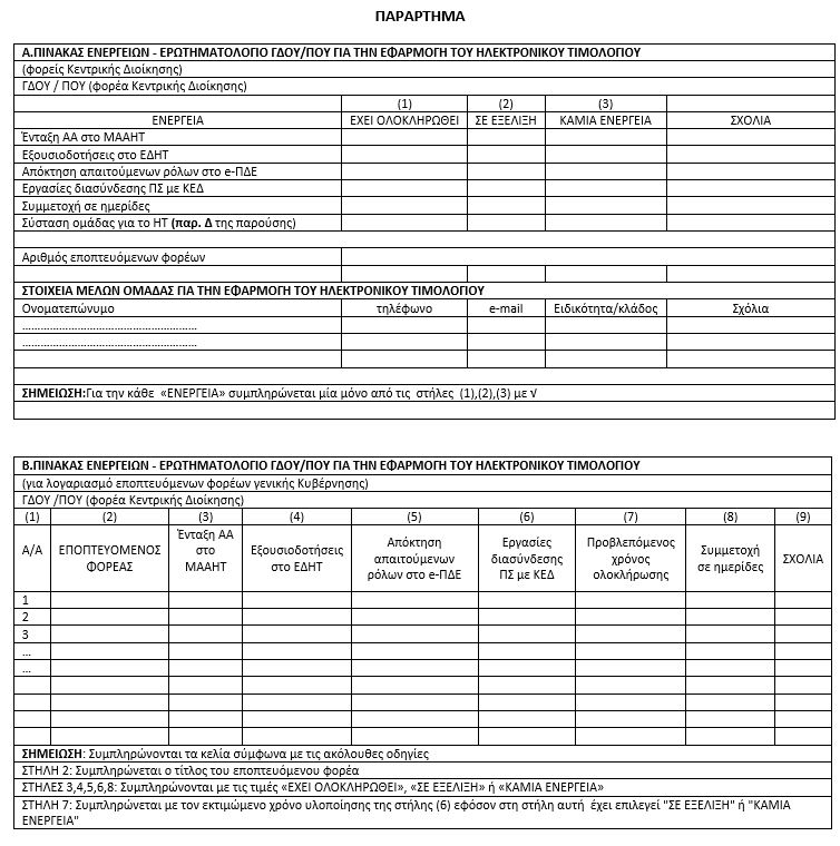 | ΕΛΛΗΝΙΚΗ ΔΗΜΟΚΡΑΤΙΑ | Αθήνα, 30 Μαρτίου 2022 | | ΥΠΟΥΡΓΕΙΟ ΟΙΚΟΝΟΜΙΚΩΝ | Α.Π.: οικ.42465 ΕΞ 2022 | | ΓΕΝΙΚΗ ΓΡΑΜΜΑΤΕΙΑ ΔΗΜΟΣΙΟΝΟΜΙΚΗΣ ΠΟΛΙΤΙΚΗΣ | | | ΓΕΝΙΚΟ ΛΟΓΙΣΤΗΡΙΟ ΤΟΥ ΚΡΑΤΟΥΣ | | | ΓΕΝΙΚΗ ΔΙΕΥΘΥΝΣΗ ΘΗΣΑΥΡΟΦΥΛΑΚΙΟΥ ΚΑΙ ΔΗΜΟΣΙΟΝΟΜΙΚΩΝ ΚΑΝΟΝΩΝ | | | Δ/ΝΣΗ: ΚΑΤΑΡΤΙΣΗΣ & ΣΥΝΤ/ΣΜΟΥ ΕΦΑΡΜΟΓΗΣ ΔΗΜΟΣΙΟΝΟΜΙΚΩΝ ΚΑΝΟΝΩΝ | | ΘΕΜΑ: Παροχή οδηγιών για τη διαχείριση ηλεκτρονικών τιμολογίων (ΗΤ) στο πλαίσιο εκτέλεσης δημοσίων συμβάσεων. Η παρούσα εγκύκλιος αποστέλλεται δεδομένης της υφιστάμενης υποχρέωσης των φορέων του Δημοσίου Τομέα για την αποδοχή ηλεκτρονικών τιμολογίων (HT) στο πλαίσιο εκτέλεσης δημοσίων συμβάσεων ώστε να παρασχεθούν οδηγίες για την εφαρμογή των διατάξεων των άρθρων 148 έως 154 του Ν.4601/2019 (Α.44), καθώς και των κατ΄ εξουσιοδότηση εκδοθεισών, κοινών υπουργικών αποφάσεων αριθ. 63446/31-5-2021 (Β.2338) & αριθ. οικ. 98979 ΕΞ2021/10-8-2021 (Β.3766), όπως ισχύουν. Δεδομένου ότι η καθιέρωση της ηλεκτρονικής τιμολόγησης στις δημόσιες συμβάσεις εντάσσεται στο πλαίσιο προώθησης της ψηφιακής μεταρρύθμισης και αυτοματοποίησης των διαδικασιών στη Δημόσια Διοίκηση, είναι κρίσιμο να εξασφαλιστεί η ετοιμότητα των φορέων του Δημοσίου Τομέα προκειμένου άμεσα αυτοί να είναι σε θέση να διαχειριστούν ηλεκτρονικά τιμολόγια. Για το λόγο αυτό θα πρέπει να δοθεί ιδιαίτερη προσοχή στη παράγραφο Δ της παρούσης, στην οποία περιγράφονται οι ΑΠΑΙΤΟΥΜΕΝΕΣ ΕΝΕΡΓΕΙΕΣ ΦΟΡΕΩΝ . Για την υποβοήθηση στην προετοιμασία των φορέων έχει συμπεριληφθεί ως παράρτημα της παρούσης πίνακας με την καταγραφή των απαιτούμενων ενεργειών ο οποίος θα πρέπει άμεσα να συμπληρωθεί αρμοδίως και να αποσταλεί ηλεκτρονικά στην Γενική Γραμματεία Πληροφοριακών Συστημάτων Δημόσιας Διοίκησης (ΓΓΠΣΔΔ) σύμφωνα με το μέρος Δ της παρούσης. Α. ΝΟΜΟΘΕΤΙΚΟ ΠΛΑΙΣΙΟ Με τις διατάξεις του ν.4601/2019, εισάγεται η υποχρέωση Φορέων που εκτελούν δημόσιες συμβάσεις οι οποίες υπάγονται στους ν. 3978/2011 (Α.137), 4412/2016 (Α.147) και 4413/2016 (Α.148) και η αξία των οποίων είναι ίση ή ανώτερη από τα κατώτατα κοινοτικά όρια, όπως αυτά ορίζονται σε κάθε περίπτωση, να παραλαμβάνουν και να διαχειρίζονται ηλεκτρονικά τιμολόγια που είναι σύμφωνα με τον ευρωπαϊκό ή/και εθνικό πρότυπο έκδοσης ηλεκτρονικών τιμολογίων. Εξαιρούνται οι συμβάσεις του ν. 3978/2011 η σύναψη και η εκτέλεση των οποίων έχουν χαρακτηριστεί απόρρητες ή πρέπει να συνοδεύονται από ειδικά μέτρα ασφαλείας. Το παραπάνω πλαίσιο θεσπίζει την υποχρεωτικότητα, από πλευράς των δημοσίων φορέων να παραλαμβάνουν ΗΤ και δεν θίγει το δικαίωμα του προμηθευτή να επιλέξει μεταξύ ηλεκτρονικής ή έγχαρτης τιμολόγησης. Σε κάθε περίπτωση οι Δημόσιοι Φορείς, ανεξαρτήτως της νομικής υποχρέωσης τους και δεδομένης της τεχνικής δυνατότητας που τους παρέχεται ήδη από την Γενική Γραμματεία Πληροφοριακών Συστημάτων Δημόσιας Διοίκησης (ΓΓΠΣΔΔ), οφείλουν να παραλαμβάνουν ΗΤ ανεξαρτήτως ύψους συμβάσεων εφόσον οι οικονομικοί φορείς υποχρεούνται, από φορολογικές ή άλλες διατάξεις, να εφαρμόσουν την ηλεκτρονική τιμολόγηση. Στο σημείο αυτό, σας γνωρίζουμε ότι σχετικά προωθείται από το Υπουργείο μας διάταξη για περαιτέρω επέκταση της υποχρεωτικότητας στη χρήση του ΗΤ. Κατ΄ εξουσιοδότηση του ανωτέρω νόμου έχουν εκδοθεί: α) η αριθ. οικ. 98979 ΕΞ2021/10-8-2021 κυα, όπως τροποποιήθηκε με την αριθμ. 13005 ΕΞ2022/1-2-2022 όμοια (Β.438), με την οποία καθορίζεται ο τρόπος διακίνησης των ΗΤ, οι διαδικασίες παραλαβής, επεξεργασίας και πληρωμής τους καθώς και 
