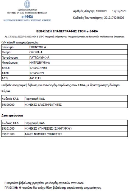 | ΕΛΛΗΝΙΚΗ ΔΗΜΟΚΡΑΤΙΑ | Αθήνα, 21/12/2020 | | ΥΠΟΥΡΓΕΙΟ ΕΡΓΑΣΙΑΣ & ΚΟΙΝΩΝΙΚΩΝ ΥΠΟΘΕΣΕΩΝ | ΑΠ:342535 | | ΗΛΕΚΤΡΟΝΙΚΟΣ ΕΘΝΙΚΟΣ ΦΟΡΕΑΣ ΚΟΙΝΩΝΙΚΗΣ ΑΣΦΑΛΙΣΗΣ | ΕΓΚΥΚΛΙΟΣ 53 | | ΓΕΝΙΚΗ ΔΙΕΥΘΥΝΣΗ ΕΙΣΦΟΡΩΝ | | | ΔΙΕΥΘΥΝΣΗ ΑΣΦΑΛΙΣΗΣ | | | ΤΜΗΜΑ ΑΣΦΑΛΙΣΗΣ ΜΗ ΜΙΣΘΩΤΩΝ | | | ΔΙΕΥΘΥΝΣΗ ΕΙΣΦΟΡΩΝ ΜΗ ΜΙΣΘΩΤΩΝ | | | ΤΜΗΜΑ ΠΡΟΣΔ/ΜΟΥ ΕΙΣΦΟΡΩΝ ΜΗ ΜΙΣΘΩΤΩΝ | | ΘΕΜΑ: Χορήγηση Βεβαίωσης Απογραφικής Δήλωσης σε περιπτώσεις επανεγγραφής στον e-ΕΦΚΑ -Νέα ηλεκτρονική υπηρεσία για Μη Μισθωτούς, Ελεύθερους Επαγγελματίες, Αυτοαπασχολούμενους και Αγρότες. ΣΧΕΤ.: - Η διάταξη του άρθρου 28 του Ν. 4659/2020 (ΦΕΚ 21/3.2.2020 τ. Α΄) περί ηλεκτρονικών συναλλαγών ασφαλισμένων του e-ΕΦΚΑ, - Οι διατάξεις της αρ. οικ. 17535/Δ1.6002/5.5.2020 Κοινής Υπουργικής Απόφασης (ΦΕΚ 1754/7.5.2020 τ. Β΄), - Η αρ. 46/2020 Εγκύκλιος του e-ΕΦΚΑ και το αριθ. 286737/4-11-2020 Γενικό Έγγραφο της Γενικής Διεύθυνσης Εισφορών. Όπως ήδη γνωρίζετε, πρόσφατα τέθηκαν σε παραγωγική λειτουργία οι νέες ηλεκτρονικές υπηρεσίες του e-ΕΦΚΑ για μη μισθωτούς Ασφαλισμένους, Ελεύθερους Επαγγελματίες, Αυτοαπασχολούμενους και Αγρότες, «Βεβαίωση Υποβολής Απογραφικής Δήλωσης», «Μεταβολή Δραστηριότητας» και «Λήξη ασφάλισης». Με την ως άνω Εγκύκλιο δόθηκαν οδηγίες σχετικά με το πεδίο εφαρμογής, τη λειτουργικότητα και τη χρήση κάθε υπηρεσίας, τη διαδικασία που ακολουθείται μέσω διαδικτύου, τον τύπο και το περιεχόμενο των παραγόμενων Βεβαιώσεων. Με το ως άνω Γενικό Έγγραφο γνωστοποιήθηκε η δυνατότητα χρήσης, κατ΄ εξαίρεση, των νέων ηλεκτρονικών υπηρεσιών από τις Περιφερειακές Υπηρεσίες και η ροή εργασιών που ακολουθείται για την ολοκλήρωση της διαδικασίας. Στο πλαίσιο επέκτασης των ηλεκτρονικών υπηρεσιών, ήδη έχει ολοκληρωθεί η υλοποίηση της νέας υπηρεσίας «Βεβαίωση Επανεγγραφής» με την οποία παρέχεται δυνατότητα χορήγησης Βεβαίωσης Υποβολής Απογραφικής Δήλωσης στις περιπτώσεις έναρξης ατομικής επαγγελματικής δραστηριότητας και επανεγγραφής στον e-ΕΦΚΑ. Με την παρούσα γνωστοποιούνται το πεδίο εφαρμογής της νέας ηλεκτρονικής υπηρεσίας, η λειτουργικότητα και η χρήση της, ο τύπος και το περιεχόμενο της παραγόμενης βεβαίωσης και ο σκοπός χορήγησής της, η διαδικασία που ακολουθείται μέσω διαδικτύου για την αξιοποίησή της, καθώς επίσης και η ροή εργασιών που απαιτείται για τη χρήση της νέας ηλεκτρονικής υπηρεσίας, κατ΄ εξαίρεση, από τις Περιφερειακές Υπηρεσίες του e-ΕΦΚΑ, μέσω της μηχανογραφικής εφαρμογής «Έσοδα - Ασφάλιση Μη Μισθωτών». ΠΕΔΙΟ ΕΦΑΡΜΟΓΗΣ Η νέα υπηρεσία απευθύνεται σε φυσικά πρόσωπα -Ελεύθερους Επαγγελματίες, Αυτοαπασχολούμενους και Αγρότες, που έχουν διακόψει την ασφάλισή τους ως μη μισθωτοί και πρόκειται να προβούν σε έναρξη εργασιών ατομικής επιχείρησης στην ΑΑΔΕ και να επανεγγραφούν στον e-ΕΦΚΑ ως Μη μισθωτοί. Στο πεδίο εφαρμογής δεν εμπίπτουν: - Ασφαλιστέα πρόσωπα που για την επανέναρξη της ασφάλισής τους δεν απαιτείται έναρξη δραστηριότητας στη ΔΟΥ - Μέλη εταιρειών - Ενώσεις προσώπων Οι ως άνω περιπτώσεις θα διεκπεραιώνονται από τις Υπηρεσίες του e-ΕΦΚΑ με την έως τώρα ακολουθούμενη διαδικασία. ΝΕΑ ΗΛΕΚΤΡΟΝΙΚΗ ΥΠΗΡΕΣΙΑ - Για τη νέα ηλεκτρονική υπηρεσία έχει αναρτηθεί σχετικό link στον ιστότοπο του e-ΕΦΚΑ www.efka.gov.gr -> Ηλεκτρονικές υπηρεσίες για ασφαλισμένους -> «Βεβαίωση Επανεγγραφής Μη Μισθωτών». Συνιστάται, πριν από την είσοδο στην υπηρεσία και για την ταχύτερη εξυπηρέτησή του, ο χρήστης να διαθέτει τους κωδικούς taxisnet, τον ΑΜΚΑ και τον/τους ΚΑΔ, κύριας κα