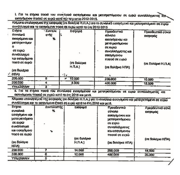 | 4. Η εισφορά για το συνολικό εισαγόμενο και μετατρεπόμενο σε ευρώ συνάλλαγμα και το συνολικό εισαγόμενο ποσό σε ευρώ κατά τα έτη 2012 έως και 2018 υπολογίζεται σε δολάρια Η.Π.Α., με βάση την επίσημη ισοτιμία μεταξύ των νομισμάτων αυτών κατά το χρόνο υποβολής της δήλωσης. Με την υποβολή της δήλωσης καταβάλλεται το ένα τέταρτο (1/4) της εισφοράς σε ευρώ και τα υπόλοιπα τρία τέταρτα (3/4) σε τρεις (3) ισόποσες δόσεις κατά τους μήνες Ιούνιο, Σεπτέμβριο και Δεκέμβριο του έτους υποβολής της δήλωσης. Η εισφορά για το συνολικό εισαγόμενο και μετατρεπόμενο σε ευρώ συνάλλαγμα και το συνολικό εισαγόμενο ποσό σε ευρώ κατά τα έτη 2019 και μετά καταβάλλεται σε δύο (2) ισόποσες δόσεις μέχρι την τελευταία εργάσιμη ημέρα των μηνών Απριλίου και Σεπτεμβρίου του έτους υποβολής της δήλωσης. Το ποσό της εισφοράς στα έτη αυτά υπολογίζεται σε δολάρια Η.Π.Α. και μετατρέπεται σε ευρώ με βάση την τιμή αναφοράς του δολαρίου Η.Π.Α. έναντι του ευρώ της Ευρωπαϊκής Κεντρικής Τράπεζας (Ε.Κ.Τ.) κατά το χρόνο υποβολής της δήλωσης. Σε περίπτωση εκπρόθεσμης υποβολής αρχικής δήλωσης, για τον υπολογισμό της εισφοράς, λαμβάνεται η τιμή αναφοράς των παραπάνω νομισμάτων κατά την καταληκτική ημερομηνία υποβολής της αρχικής δήλωσης. Σε περίπτωση υποβολής τροποποιητικής δήλωσης, για τον υπολογισμό της εισφοράς, λαμβάνεται η τιμή αναφοράς των νομισμάτων αυτών που έχει ληφθεί με την αρχική δήλωση, σύμφωνα με τα αναφερόμενα στα δύο προηγούμενα εδάφια. Για την καταβολή της εισφοράς ευθύνονται αλληλέγγυα και εις ολόκληρον οι διευθυντές, διαχειριστές και γενικά οι εκπρόσωποι των επιχειρήσεων της παραγράφου 1, βάσει του τίτλου που έχει αποκτηθεί έστω για έναν από τους υπόχρεους, ο οποίος ισχύει και ως προς τους άλλους υπόχρεους για τη λήψη των αναγκαίων μέτρων για την είσπραξη της εισφοράς. |