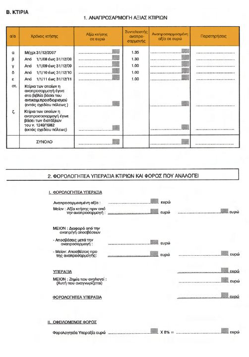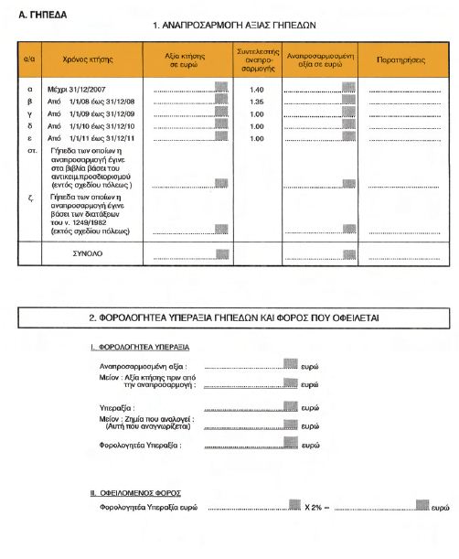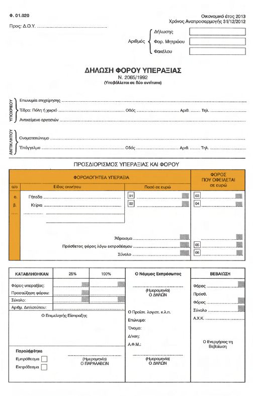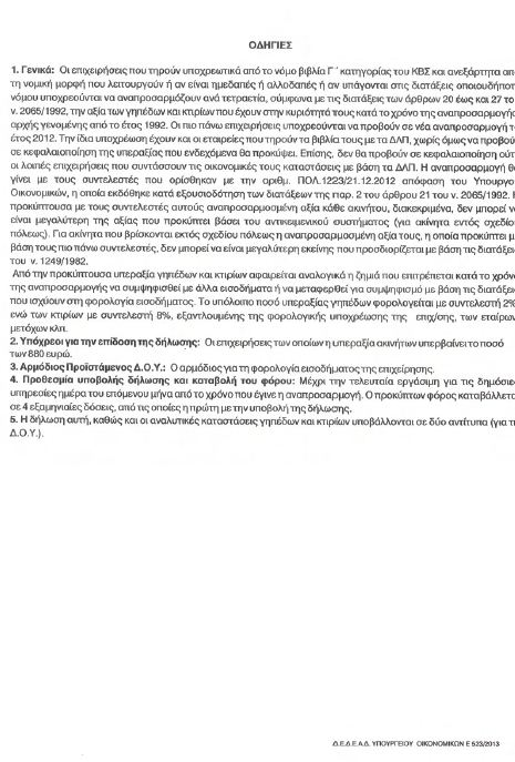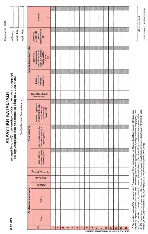 | ΕΦΗΜΕΡΙΣ ΤΗΣ ΚΥΒΕΡΝΗΣΕΩΣ ΤΗΣ ΕΛΛΗΝΙΚΗΣ ΔΗΜΟΚΡΑΤΙΑΣ ΤΕΥΧΟΣ ΔΕΥΤΕΡΟ Αρ. Φύλλου 225 5 Φεβρουαρίου 2013 Αριθ. 1012 Τύπος και περιεχόμενο της δήλωσης φόρου υπεραξίας που προβλέπεται από τις διατάξεις της παραγράφου 3 του άρθρου 25 του N . 2065/1992. Ο ΥΦΥΠΟΥΡΓΟΣ ΟΙΚΟΝΟΜΙΚΩΝ Έχοντας υπόψη: α) Τις διατάξεις της παραγράφου 1 του άρθρου 21 του N. 2065/1992 (ΦΕΚ 113/A΄), σύμφωνα με τις οποίες, οι επιχειρήσεις του άρθρου 20 του ίδιου νόμου υποχρεούνται να αναπροσαρμόζουν από το έτος 1992 και μετά, ανά τετραετία, την αξία των γηπέδων και κτιρίων τους. β) Τις διατάξεις της παραγράφου 3 του άρθρου 25 του Ν. 2065/1992 , σύμφωνα με τις οποίες, με απόφαση του Υπουργού Οικονομικών, που δημοσιεύεται στην Εφημερίδα της Κυβερνήσεως, καθορίζονται ο τύπος και το περιεχόμενο της δήλωσης. γ) Την αριθ. ΥΠΟΙΚ 07927 ΕΞ2012 (ΦΕΚ 2574 Β΄/24.9.2012) κοινή απόφαση του Πρωθυπουργού «Ανάθεση αρμοδιοτήτων στον Υφυπουργό Οικονομικών Γεώργιο Μαυραγάνη». δ) Ότι από τις διατάξεις της απόφασης αυτής δεν προκαλείται δαπάνη σε βάρος του Κρατικού Προϋπολογισμού, αποφασίζουμε: 1. Ορίζουμε ότι η δήλωση φόρου υπεραξίας, για το έτος 2012, που προκύπτει από την αναπροσαρμογή της αξίας των ακινήτων των επιχειρήσεων, αποτελείται από τρία έντυπα, ήτοι: α. Από τη δήλωση φόρου υπεραξίας. β. Από την αναλυτική κατάσταση των κτιρίων, η αξία των οποίων υπόκειται σε αναπροσαρμογή. γ. Από την αναλυτική κατάσταση των γηπέδων, η αξία των οποίων υπόκειται σε αναπροσαρμογή. 2. Ο τύπος και το περιεχόμενο της πιο πάνω δήλωσης έχει ως τα συνημμένα υποδείγματα Φ.01.020, Φ.01.021 και Φ.01.022, τα οποία επισυνάπτονται ως παράρτημα της παρούσας. 3. Σημειώνεται ότι στον πίνακα 2 του εντύπου της δήλωσης φόρου υπεραξίας (Φ.01.020), για τον υπολογισμό της φορολογητέας υπεραξίας γηπέδων και κτιρίων και του φόρου που οφείλεται, κατά περίπτωση, όπως αυτός έχει απεικονισθεί στην εφαρμογή παραλαβής της δήλωσης στο σύστημα TAXIS, το πεδίο «Μείον: Ζημία που αναλογεί (αυτή που αναγνωρίζεται)» έχει χαρακτηρισθεί ως κωδικός 449.       Η απόφαση αυτή να δημοσιευθεί στην Εφημερίδα της Κυβερνήσεως. Αθήνα, 25 Ιανουαρίου 2013 Ο ΥΦΥΠΟΥΡΓΟΣ ΓΕΩΡΓΙΟΣ ΜΑΥΡΑΓΑΝΗΣ |
