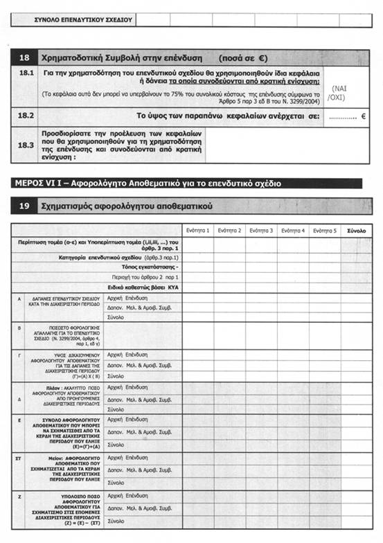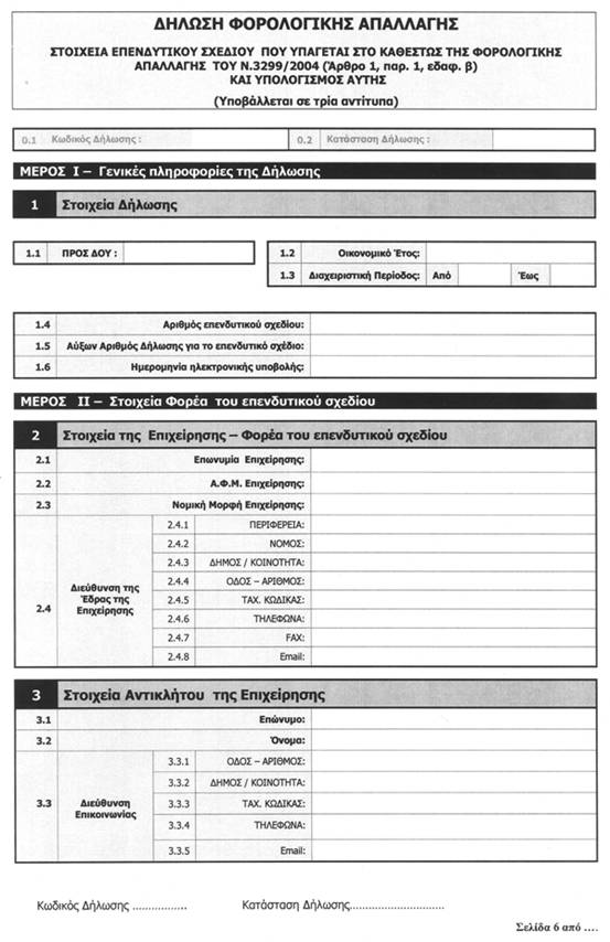 | 1. ΓΕΝΙΚΗ ΓΡΑΜΜΑΤΕΙΑ ΦΟΡΟΛΟΓΙΚΩΝ ΚΑΙ ΤΕΛΩΝΕΙΑΚΩΝ ΘΕΜΑΤΩΝ | Αθήνα, 9 Νοεμβρίου 2006 | | ΓΕΝΙΚΗ Δ/ΝΣΗ ΦΟΡΟΛΟΓΙΑΣ | Αρ.Πρωτ.: 1100384/11194/Β0012 | | ΔΙΕΥΘΥΝΣΗ ΦΟΡΟΛ. ΕΙΣΟΔ/ΤΟΣ (Δ12) | ΠΟΛ. 1130 | | ΤΜΗΜΑ: Β΄ | | | 2. ΓΕΝΙΚΗ Δ/ΝΣΗ ΙΔΙΩΤΙΚΩΝ ΕΠΕΝΔΥΣΕΩΝ | | | Δ/ΝΣΗ ΕΓΚΡΙΣΗΣ ΚΑΙ ΕΛΕΓΧΟΥ ΙΔ. ΕΠΕΝΔΥΣΕΩΝ | | ΘΕΜΑ: Καθορισμός δικαιολογητικών και στοιχείων που υποβάλλονται από τον επενδυτή και είναι απαραίτητα για τον έλεγχο των επενδύσεων και την ενημέρωση της Γενικής Διεύθυνσης Ιδιωτικών Επενδύσεων για την εφαρμογή της φορολογικής απαλλαγής του Ν. 3299/2004 (ΦΕΚ 261 Α΄). ΑΠΟΦΑΣΗ Ο ΥΠΟΥΡΓΟΣ ΟΙΚΟΝΟΜΙΑΣ ΚΑΙ ΟΙΚΟΝΟΜΙΚΩΝ Έχοντας υπόψη: 1. Τις διατάξεις της περ. γ΄ της παρ. 20 του άρθρου 7 του Ν. 3299/2004 «Κίνητρα Ιδιωτικών Επενδύσεων για την Οικονομική Ανάπτυξη και την Περιφερειακή Σύγκλιση» (ΦΕΚ 261Α΄/23.12.2004). 2. Το άρθρο 90 του «Κώδικα για την Κυβέρνηση και τα Κυβερνητικά όργανα» που κυρώθηκε με το άρθρο πρώτο του Π.Δ. 63/2005 (ΦΕΚ Α΄ 98). 3. Τις διατάξεις του Π.Δ. 121/2004 (ΦΕΚ84/Α/10.03.2004) «Διορισμός Υπουργών και Υφυπουργών». 4. Το Π.Δ. 33/15.02.2006 «Διορισμός μελών της Κυβέρνησης και Υφυπουργών» (ΦΕΚ 35/Α/2006). 5. Τις διατάξεις του Π.Δ. 178/2000 (ΦΕΚ 165/τ. Α΄/14.07.2000) «Περί Οργανισμού του Υπουργείου Εθνικής Οικονομίας». 6. Το υπ΄ αριθμ. 81/20.03.2002 Π.Δ. (ΦΕΚ 57/Α/21.03.2002) «Συγχώνευση των Υπουργείων Εθνικής Οικονομίας και Οικονομικών στο Υπουργείο Οικονομίας και Οικονομικών». 7. Την υπ΄ αριθμ. 37930/ΔΙΟΕ 1264/14.10.2005 (ΦΕΚ 1432/Β/14.10.2005) κοινή Απόφαση του Πρωθυπουργού και Υπουργού Οικονομίας και Οικονομικών περί «Καθορισμού αρμοδιοτήτων των Υφυπουργών Οικονομίας και Οικονομικών». 8. Την αριθμ. πρωτ. 1025990/26509/10127/ ΠΟΛ.1060/07.03.1991 Απόφαση του Υπουργού Οικονομίας και Οικονομικών κατ΄ εξουσιοδότηση των διατάξεων της παραγράφου 4 του άρθρου 13 του Ν. 1892/1990, που διατηρήθηκε σε ισχύ με το άρθρο 12 παρ.2 περίπτωση (ιθ) του Ν. 3299/2004. ΑΠΟΦΑΣΙΖΟΥΜΕ `Αρθρο 1 1. Η προβλεπόμενη από τις διατάξεις της περίπτωσης β΄ της παραγράφου 1 του άρθρου 4 του Ν. 3299/2004 απαλλαγή από το φόρο εισοδήματος των επιχειρήσεων για ενισχυόμενες δαπάνες επενδυτικών σχεδίων που αρχίζουν να πραγματοποιούνται από τις 23 Φεβρουαρίου 2005 και μετά και υπάγονται στο άρθρο 3 του ιδίου νόμου και στις Υπουργικές Αποφάσεις, που εκδίδονται κατ΄ εξουσιοδότηση του ιδίου αυτού άρθρου και νόμου, αναγνωρίζεται από την αρμόδια Φορολογική Αρχή, μετά από έλεγχο των τηρουμένων, από τις ανωτέρω επιχειρήσεις, βιβλίων που προβλέπονται από τις διατάξεις του Κ.B.Σ., όπως ισχύουν κάθε φορά και εφόσον υφίστανται οι προϋποθέσεις της παρ. 20 του άρθρου 7 του Ν. 3299/2004 και προσκομίζονται τα σχετικά αποδεικτικά στοιχεία. 2. Ως αποδεικτικά στοιχεία των πιο πάνω ενισχυόμενων δαπανών εξακολουθούν να ισχύουν αυτά που ορίζονται με την παράγραφο 2 της αριθμ. πρωτ. 1025990/26509/10127/ ΠΟΛ. 1060/07.03.1991 (ΦΕΚ191Β΄/29.03.1991) Απόφασης του Υπουργού Οικονομίας και Οικονομικών. 3. Για την εφαρμογή της φορολογικής απαλλαγής απαιτούνται, εκτός των λοιπών δικαιολογητικών, οι κατά περίπτωση βεβαιώσεις - γνωμοδοτήσεις των αρμοδίων Υπηρεσιών που προβλέπονται από τον Νόμο και τις κατά εξουσιοδότηση αυτού Υπουργικές αποφάσεις. Επιπλέον, για τα επενδυτικά σχέδια της υποπερίπτωσης (ix) της περίπτωσης ε΄ του άρθρου 3 του Ν. 3299/2004 απαιτείται σχετική γνωμοδότηση της ΓΓΑ του Υπουργείου Ανάπτυξης ως προς τον χαρακτηρισμό τους ως ολοκληρωμένα πολυετή επιχειρηματικά σχέδια. Οι ανωτέρω βεβαιώσεις- γνωμοδοτήσεις λαμβάνονται με πρωτοβουλία του φορέα της επένδυσης και υποβάλλονται ως συνη