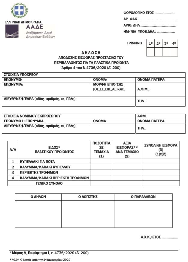 | ΕΦΗΜΕΡΙΔΑ ΤΗΣ ΚΥΒΕΡΝΗΣΕΩΣ ΤΗΣ ΕΛΛΗΝΙΚΗΣ ΔΗΜΟΚΡΑΤΙΑΣ 20 Δεκεμβρίου 2021 ΤΕΥΧΟΣ ΔΕΥΤΕΡΟ Αρ. Φύλλου 5982 Αριθμ. Α.1251 Καθορισμός του τύπου και του περιεχομένου της δήλωσης απόδοσης της εισφοράς προστασίας του περιβάλλοντος για τα πλαστικά προϊόντα, σύμφωνα με τις διατάξεις του άρθρου 4 του Ν. 4736/2020 (Α΄ 200), καθώς και της διαδικασίας επιβολής, είσπραξης και απόδοσης αυτής. Ο διοικητής ΤΗΣ ΑΝΕΞΑΡΤΗΤΗΣ ΑΡΧΗΣ ΔΗΜΟΣΙΩΝ ΕΣΟΔΩΝ Έχοντας υπόψη: 1. Τις διατάξεις: α) της περ. β΄ της παρ. 3 του άρθρου 4 και του άρθρου 19 του Ν.4736/2020 «Ενσωμάτωση της Οδηγίας (ΕΕ) 2019/904 σχετικά με τη μείωση των επιπτώσεων ορισμένων πλαστικών προϊόντων στο περιβάλλον και λοιπές διατάξεις» (Α΄ 200), β) των άρθρων 106 , 107 και 108 του Ν. 4819/2021 «Ολοκληρωμένο πλαίσιο για τη διαχείριση των αποβλήτων - Ενσωμάτωση των Οδηγιών 2018/ 851 και 2018/852 του Ευρωπαϊκού Κοινοβουλίου και του Συμβουλίου της 30ής Μαΐου 2018 για την τροποποίηση της Οδηγίας 2008/98/ΕΚ περί αποβλήτων και της Οδηγίας 94/62/ ΕΚ περί συσκευασιών και απορριμμάτων συσκευασιών, πλαίσιο οργάνωσης του Ελληνικού Οργανισμού Ανακύκλωσης, διατάξεις για τα πλαστικά προϊόντα και την προστασία του φυσικού περιβάλλοντος, χωροταξικές -πολεοδομικές, ενεργειακές και συναφείς επείγουσες ρυθμίσεις» (Α΄129), γ) του Κεφαλαίου Α΄ του Μέρους Πρώτου του ν. 4389/2016 «Επείγουσες διατάξεις για την εφαρμογή της συμφωνίας δημοσιονομικών στόχων και διαρθρωτικών μεταρρυθμίσεων και άλλες διατάξεις» (Α΄94) και ειδικότερα του άρθρου 7 , της παρ. 1 του άρθρου 14 και του άρθρου 41 αυτού . δ) του ν. 4174/2013 « Κώδικας Φορολογικής διαδικασίας και άλλες διατάξεις» (Α΄170) και ιδίως των άρθρων 6 , 18 , 19 και 20 . ε) των άρθρων 81 έως και 86 του Ν. 4270/2014 «Αρχές δημοσιονομικής διαχείρισης και εποπτείας (ενσωμάτωση της οδηγίας 2011/85/ΕΕ) - Δημόσιο Λογιστικό» (Α΄143). στ) της υπό στοιχεία Δ.ΟΡΓ.Α 1125859 ΕΞ2020/23.10.2020, απόφασης του Διοικητή της Ανεξάρτητης Αρχής Δημοσίων Εσόδων «Οργανισμός της Ανεξάρτητης Αρχής Δημοσίων Εσόδων (Α.Α.Δ.Ε.)» (Β΄4738). στ) της υποπαρ. Ε2 της παρ. Ε του πρώτου άρθρου του ν. 4093/2012, περί σύστασης θέσης Γενικού Γραμματέα Δημοσίων Εσόδων (A΄ 222), σε συνδυασμό με τις διατάξεις της παρ. 1 του άρθρου 13 και της παρ. 10 του άρθρου 41 του Ν. 4389/2016. 2. Την υπό στοιχεία Δ6Α 1015213 ΕΞ 2013/28.1.2013 απόφαση του Υπουργού Οικονομικών και Υφυπουργού Οικονομικών «Μεταβίβαση αρμοδιοτήτων στον Γενικό Γραμματέα της Γενικής Γραμματείας Δημοσίων Εσόδων του Υπουργείου Οικονομικών» (Β΄130 και Β΄372), σε συνδυασμό με τις διατάξεις της υποπαρ. Α΄ της παρ. 3 του άρθρου 41 του Ν. 4389/2016 . 3. Την υπ ΄αρ. 1 της 20.01.2016 πράξη του Υπουργικού Συμβουλίου «Επιλογή και διορισμός Γενικού Γραμματέα της Γενικής Γραμματείας Δημοσίων Εσόδων του Υπουργείου Οικονομικών», (Υ.Ο.Δ.Δ. 18), σε συνδυασμό με τις διατάξεις του πρώτου εδαφίου της παρ. 10 του άρθρου 41 του Ν. 4389/2016, και τις αποφάσεις υπ΄αρ. 39/3/ 30.11.2017 (Υ.Ο.Δ.Δ. 689) του Συμβουλίου Διοίκησης της Ανεξάρτητης Αρχής Δημοσίων Εσόδων και υπ΄αρ. 5294 ΕΞ 2020/17.1.2020 του Υπουργού Οικονομικών «Ανανέωση της θητείας του Διοικητή της Ανεξάρτητης Αρχής Δημοσίων Εσόδων» (Υ.Ο.Δ.Δ. 27). 4. Την υπό στοιχεία 2/100546/ΔΠΓΚ/12.10.2021 απόφαση που τροποποιεί την υπό στοιχεία 2/58493/ΔΠΓΚ/ 31.07.2018 του Αναπληρωτή Υπουργού Οικονομικών «Οικονομική και Διοικητική Ταξινόμηση του κρατικού προϋπολογισμού» (Β΄4727). 5. Την ανάγκη καθορισμού του τύπου και του περιεχομένου της δήλωσης απόδοσης της εισφοράς προστασίας του περιβάλλοντος για τα πλαστικά προϊόντα και της διαδικασίας επιβολή