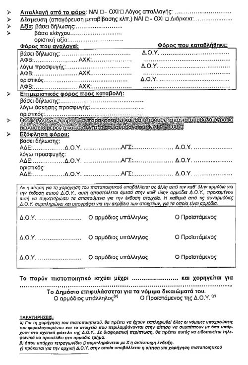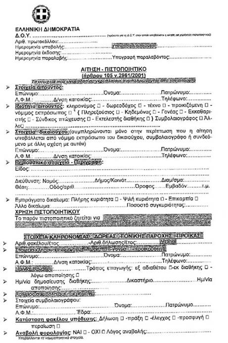 | ΕΛΛΗΝΙΚΗ ΔΗΜΟΚΡΑΤΙΑ | Αθήνα, 6 Φεβρουαρίου 2004 | | ΥΠΟΥΡΓΕΙΟ ΟIΚΟΝΟΜIΑΣ ΚΑΙ ΟΙΚΟΝΟΜΙΚΩΝ | Αρ.Πρωτ.: 1011294/70/Α 0013 | | ΓΕΝ. ΔΙΕΥΘΥΝΣΗ ΦΟΡΟΛΟΓΙΑΣ | ΠΟΛ.1015 | | ΔΙΕΥΘΥΝΣΗ ΦΟΡΟΛΟΓΙΑΣ ΚΕΦΑΛΑΙΟΥ | | | ΤΜΗΜΑ Α΄ | | ΘΕΜΑ:Τύπος και περιεχόμενο της αίτησης και του πιστοποιητικού του άρθρου 105 του Ν. 2961/2001 και διαδικασία χορήγησης αυτού. ΑΠΟΦΑΣΗ Ο ΥΠΟΥΡΓΟΣ ΟΙΚΟΝΟΜΙΑΣ ΚΑΙ ΟΙΚΟΝΟΜΙΚΩΝ Έχοντας υπόψη: 1) Τις διατάξεις του Ν. 2961/2001 (Φ.Ε.Κ. 266 Α΄) «Κύρωση του Κώδικα Διατάξεων Φορολογίας Κληρονομιών, Δωρεών, Γονικών Παροχών και Κερδών από Λαχεία». 2) Τις διατάξεις της παραγράφου 4 του άρθρου 26 του Ν.3220/2004 (Φ.Ε.Κ 15 τ. Α΄) «Μέτρα αναπτυξιακής και κοινωνικής πολιτικής - Αντικειμενικοπoίηση του φορολογικού έλεγχου και άλλες διατάξεις». 3) Την 1065956/863/A΄0006/15-7-2003 κοινή απόφαση του Πρωθυπουργού και του Υπουργού Οικονομίας και Οικονομικών (Φ.Ε.Κ. 985 τ. B΄), με την οποία καθορίζονται οι αρμοδιότητες των Υφυπουργών Οικονομίας και Οικονομικών. 4) Το γεγονός ότι με την παρούσα απόφαση δεν προκαλείται δαπάνη στον Κρατικό Προϋπολογισμό. ΑΠΟΦΑΣΙΖΟΥΜΕ 1) Η αίτηση για τη χορήγηση του πιστοποιητικού του άρθρου 105 του Ν. 2961/2001 και το πιστοποιητικό αυτό αποτελούν ενιαίο έντυπο, τον τύπο και το περιεχόμενο του οποίου καθορίζουμε σύμφωνα με το σχέδιο που είναι συνημμένο στην παρούσα και αποτελεί αναπόσπαστο μέρος αυτής. 2) Καθορίζουμε τη διαδικασία χορήγησης του πιστοποιητικού του άρθρου 105 του Ν. 2961/2001 ως ακολούθως: • Η αίτηση για τη χορήγηση του πιστοποιητικού φόρου κληρονομιάς, δωρεάς ή γονικής. παροχής για περιουσιακά στοιχεία, που αποτελούν αντικείμενο κτήσης αιτία θανάτου, δωρεάς ή γονικής παροχής, υποβάλλεται ή αποστέλλεται με τηλεομοιοτυπία (fax) στη Δημόσια Οικονομική Υπηρεσία (Δ.Ο.Υ.) την αρμόδια για την κληρονομιά, δωρεά ή γονική παροχή ή την αρμόδια για τη φορολογία εισοδήματος του δικαιούχου του πιστοποιητικού. • Αν το πιστοποιητικό φόρου κληρονομιάς, δωρεάς ή γονικής παροχής απαιτείται για τη μεταβίβαση περιουσιακών στοιχείων, που αποτελούν αντικείμενο κτήσης αιτία θανάτου, δωρεάς ή γονικής παροχής η αίτηση, για τη χορήγησή του μπορεί να υποβάλλεται και από το συμβολαιογράφο, ο οποίος θα συντάξει το μεταβιβαστικό συμβολαιογραφικό έγγραφο, στη Δ.Ο.Υ. την αρμόδια για τη μεταβίβαση των περιουσιακών αυτών στοιχείων. • Η Δ.Ο.Υ., στην οποία υποβάλλεται η αίτηση, την καταχωρεί και αποστέλλει άμεσα αντίγραφα αυτής με fax στις συναρμόδιες Δ.Ο.Υ. προκειμένου με οίκοθεν διαδικασία να διαπιστώσει την ακρίβεια των δηλωθέντων στοιχείων καθώς και το ποσό του επιμεριστικά αναλογούντα φόρου κληρονομιών, δωρεών και γονικών παροχών και να παραδώσει το πιστοποιητικό μετά την εξόφληση του φόρου, στο φορολογούμενο ή στο συμβολαιογράφο. 3) Η απόφαση αυτή να δημoσιευθεί στην Εφημερίδα Κυβερνήσεως.   |