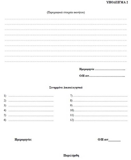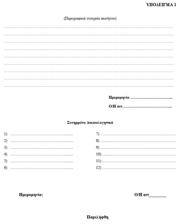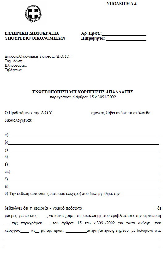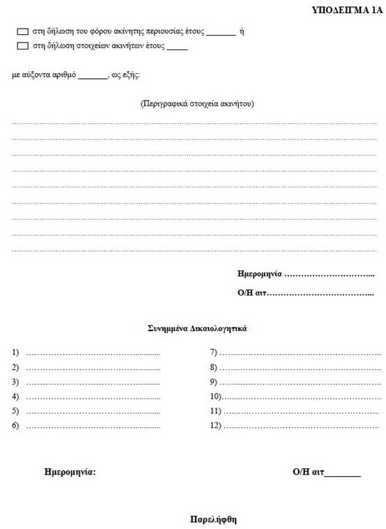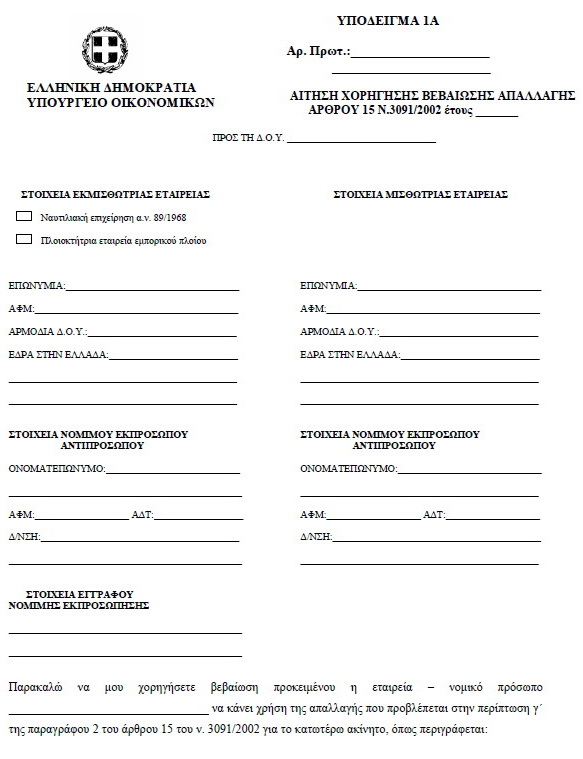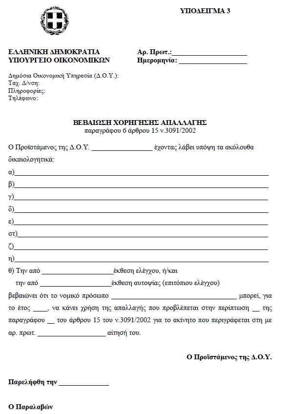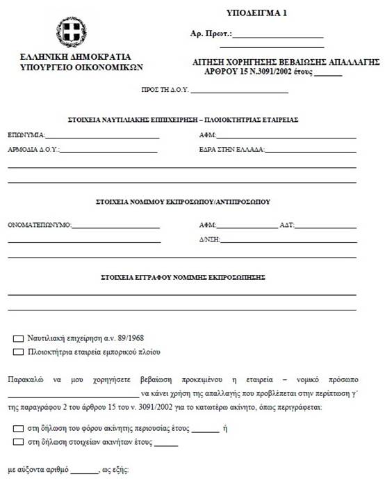 | ΕΦΗΜΕΡΙΣ ΤΗΣ ΚΥΒΕΡΝΗΣΕΩΣ ΤΗΣ ΕΛΛΗΝΙΚΗΣ ΔΗΜΟΚΡΑΤΙΑΣ ΤΕΥΧΟΣ ΔΕΥΤΕΡΟ Αρ. Φύλλου 1242 14 Ιουνίου 2011 ΑΠΟΦΑΣΕΙΣ Αριθμ. ΠΟΛ. 1112 Διαδικασία χορήγησης των απαλλαγών από τον ειδικό φόρο επί των ακινήτων των περιπτώσεων γ΄ και στ΄ της παραγράφου 2 και δ΄ της παραγράφου 3 του άρθρου 15 του N . 3091/2002, απαιτούμενα δικαιολογητικά και ημερομηνία υποβολής των σχετικών αιτήσεων για το έτος 2011 και κάθε επόμενο. Ο ΥΦΥΠΟΥΡΓΟΣ ΟΙΚΟΝΟΜΙΚΩΝ Έχοντας υπόψη: 1. Τις διατάξεις των περιπτώσεων γ΄ και στ΄ της παραγράφου 2 και δ΄ της παραγράφου 3 του άρθρου 15 του N. 3091/2002 (ΦΕΚ 330 Α΄/24-12-2002), όπως αντικαταστάθηκε με την παράγραφο 1 του άρθρου 57 του N. 3842/2010 (ΦΕΚ 58 Α΄/23-04-2010) και συμπληρώθηκε με την παράγραφο 8 του άρθρου 24 του N. 3943/2011 (ΦΕΚ 66 Α΄/31-03-2011). 2. Τις διατάξεις της παραγράφου 7 του άρθρου 17 του N. 3091/2002, όπως ισχύει. 3. Τις διατάξεις της παραγράφου 6 του άρθρου 15 του N. 3091/2002, με τις οποίες προβλέπεται ότι η απαλλαγή των περιπτώσεων γ΄ και στ΄ της παραγράφου 2 και δ΄ της παραγράφου 3 του ιδίου άρθρου χορηγείται κατόπιν υποβολής αίτησης, και με τις οποίες εξουσιοδοτείται ο Υπουργός Οικονομικών να καθορίζει τα δικαιολογητικά, το χρόνο, τη διαδικασία και κάθε άλλη αναγκαία λεπτομέρεια για τη χορήγηση των απαλλαγών αυτών. 4. Την αριθ. Δ6Α 1142500 ΕΞ 2010 κοινή απόφαση του Πρωθυπουργού και του Υπουργού Οικονομικών «Ανάθεση αρμοδιοτήτων στον Υφυπουργό Οικονομικών Δημήτριο Κουσελά» (ΦΕΚ 1725 Β΄/3-11-2010). 5. Το γεγονός ότι με την παρούσα απόφαση δεν προ-καλείται δαπάνη σε βάρος του Κρατικού Προϋπολογισμού, αποφασίζουμε: A ρθρο 1 Για την απαλλαγή της περίπτωσης γ΄ της παραγράφου 2 του άρθρου 15 του N. 3091/2002, απαιτούνται τα ακόλουθα: 1. Ναυτιλιακές επιχειρήσεις - Απαιτούμενα δικαιολογητικά Για την εφαρμογή του άρθρου 15 του N. 3091/2002 ως ναυτιλιακές επιχειρήσεις θεωρούνται αυτές που έχουν εγκαταστήσει γραφεία στην Ελλάδα, σύμφωνα με τις διατάξεις του α.ν. 89/1967 (ΦΕΚ 132 Α΄), όπως τροποποιήθηκε και συμπληρώθηκε με τον α.ν. 378/1968 (ΦΕΚ 82 Α΄), το N. 27/1975 (ΦΕΚ 77 Α΄), το N. 814/1978 (ΦΕΚ 144 Α΄) και το N. 2234/1994 (ΦΕΚ 142 Α΄). Οι ναυτιλιακές επιχειρήσεις, προκειμένου να τύχουν της απαλλαγής του ειδικού φόρου επί των ακινήτων για τα ακίνητα που την 1η Ιανουαρίου του έτους φορολογίας ιδιοχρησιμοποιούν στην Ελλάδα αποκλειστικά ως γραφεία ή αποθήκες για την κάλυψη των λειτουργικών τους αναγκών ή εκμισθώνουν σε ναυτιλιακές επιχειρήσεις αποκλειστικά ως γραφεία ή αποθήκες για την κάλυψη των λειτουργικών τους αναγκών, υποχρεούνται να υποβάλλουν κατ? έτος στην αρμόδια για τη φορολογία εισοδήματος Δημόσια Οικονομική Υπηρεσία (Δ.Ο.Υ.) τα ακόλουθα δικαιολογητικά: Α. Ναυτιλιακές επιχειρήσεις για τα ακίνητα που ιδιοχρησιμοποιούν α1) Αίτηση, σύμφωνα με το Υπόδειγμα 1, το οποίο επισυνάπτεται και αποτελεί αναπόσπαστο τμήμα της παρούσας, με την οποία ζητούν να εγκριθεί η απαλλαγή από τον ειδικό φόρο επί των ακινήτων για τα ακίνητα που ιδιοχρησιμοποιούν αποκλειστικώς ως γραφεία ή αποθήκες για την κάλυψη των λειτουργικών τους αναγκών. Στην αίτηση θα πρέπει να γίνεται περιγραφή του ακινήτου για το οποίο ζητείται η απαλλαγή, η οποία να ταυτίζεται με την περιγραφή του ακινήτου στη δήλωση Φόρου Ακίνητης Περιουσίας του προηγούμενου έτους από το έτος φορολογίας ή στη δήλωση στοιχείων ακινήτων του έτους φορολογίας, εφόσον υπάρχουν μεταβολές σε αυτό την 1η Ιανουαρίου του έτους φορολογίας. α2) Το Φύλλο της Εφημερίδας της Κυβερνήσεως στο οποίο έχει δημοσιευθεί η απόφαση με 